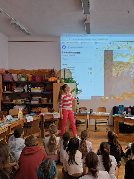 Velünk tartott Zsibrita–Gácsi Zsuzsi óvónéni is, aki nemcsak alkotásait mutatta be, de arról is mesélt, mit jelent számára a festés, milyen örömet és szabadságot ad az önkifejezés. Kedvessége és őszinte lelkesedése minden gyermeket magával ragadott, és záporoztak felé a kérdések.
